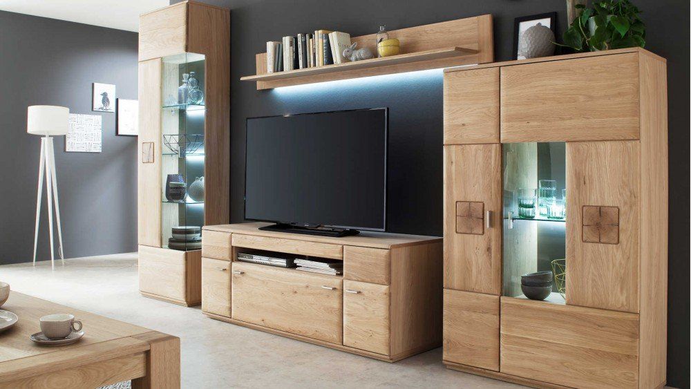 ButtonModell TL 2764 - Wohnwand natürlich schön. Diese moderne Anbauwand aus massiver Wildeiche Bianco geölt überzeugt durch ihr zeitlos elegantes Design. Die Glaselemente setzen moderne Akzente. Viel Stauraum bieten Ihnen die Vitrine und das Hängeelement hinter den Holztüren. Ihr Fernseher passt bestens auf das Lowboard und in dessen Nische können Sie den DVD-Player oder Receiver platzieren. Am Abend setzen Sie mit der LED-Glaskantenbeleuchtung schöne Akzente. Sie erhalten ein Möbelstück das Bestens zum modernen Lebensstil passt.