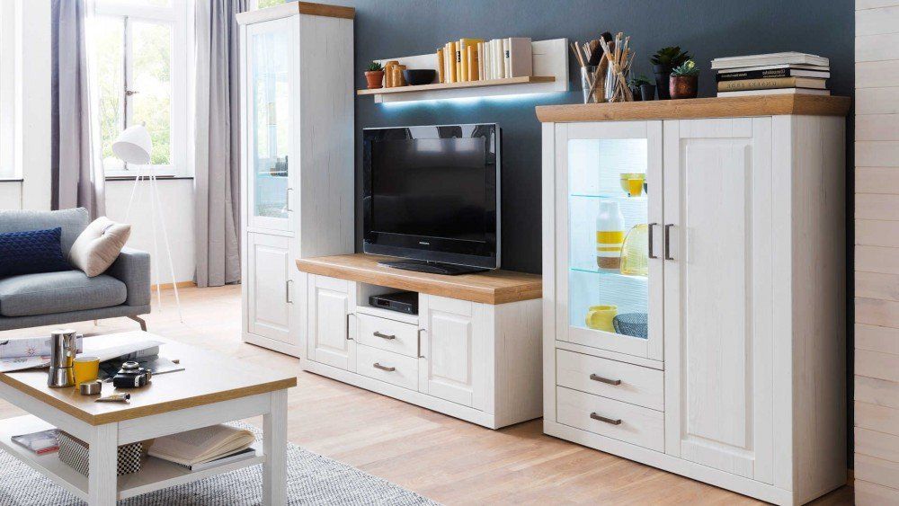 ButtonModell TL 2286 - Wohnwand im Landhausstil Pinie NB mit Absetzung Eiche und optionaler Beleuchtung, BHT ca. 369x210x52cm, bestehend aus Vitrine + TV-Element + Wandboard + Highboard